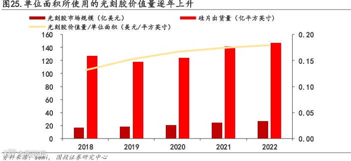 制程升级带动光刻次数增加,单位面积光刻胶价值量提升。根据SEMI的数据计算,单位面积所使用的光刻胶价值量从2018年0.13美元/平方英寸上升到2022年约0.18美元/平方英寸,2018-2022CAGR为8.48%,平均价值量的提升主要来源于先进制程占比的提升以及光刻次数的增加。
