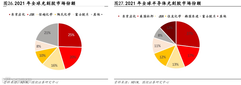 全球光刻胶市场集中度高,日美韩等海外厂商垄断。2021年全球光刻胶市场份额前五名依次为东京应化、JSR、信越化学、陶氏化学、富士胶片,合计占比79.5%。半导体光刻胶技术壁垒较高,目前全球半导体光刻胶市场由日美韩厂商主导,东京应化、JSR、住友化学、富士胶片,四大日本企业分别占据27%、13%、12%、8%市场份额,美国杜邦、韩国东进占据17%、11%的市场份额。