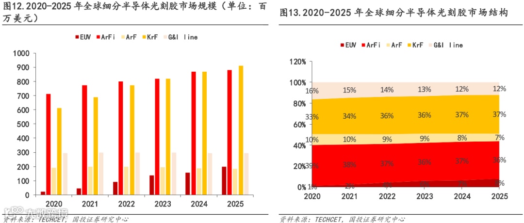 半导体光刻胶市场中以ArF份额最高,EUV增速最快。根据TECHCET统计,全球半导体光刻胶市场中,按照曝光波长分类,2022年ArF干式和ArFi浸没式光刻胶共计占46%的市场份额,KrF和g线/i线光刻胶市场份额分别为36%和14%。其中由于ArFi浸没式光刻胶主要用于先进制程中的多重曝光过程,因此其需求量为普通光刻胶的2-4倍,份额占比最高。根据TECHCET数据,2022年全球ArFi浸没式光刻胶市场规模为8亿美元,ArF干式光刻胶市场规模为2亿美元。EUV光刻胶规模增速最快,TECHCET预计其2025年将增至2亿美元,2022-2025CAGR约为30%,其次为增速较快的依次为KrF光刻胶和ArFi光刻胶。随着半导体制程提升,ArF(包括ArFi)光刻胶及EUV光刻胶市场有望持续高景气扩容。