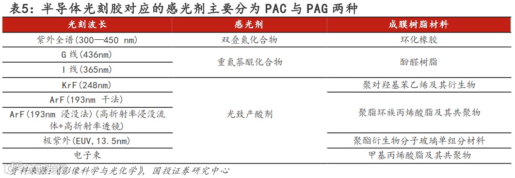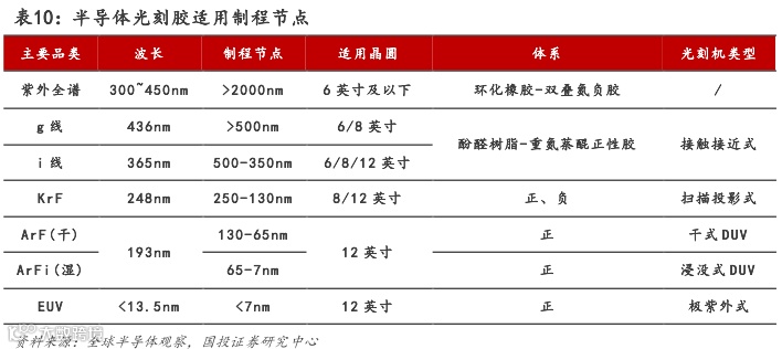 半导体光刻胶:包括紫外宽谱光刻胶、g线光刻胶、i线光刻胶、KrF光刻胶、ArF光刻胶和EUV光刻胶。半导体光刻胶根据曝光光源波长进行分类,经历了从紫外光源到深紫外光源,再到极紫外光源的发展过程,用于半导体器件的制备。