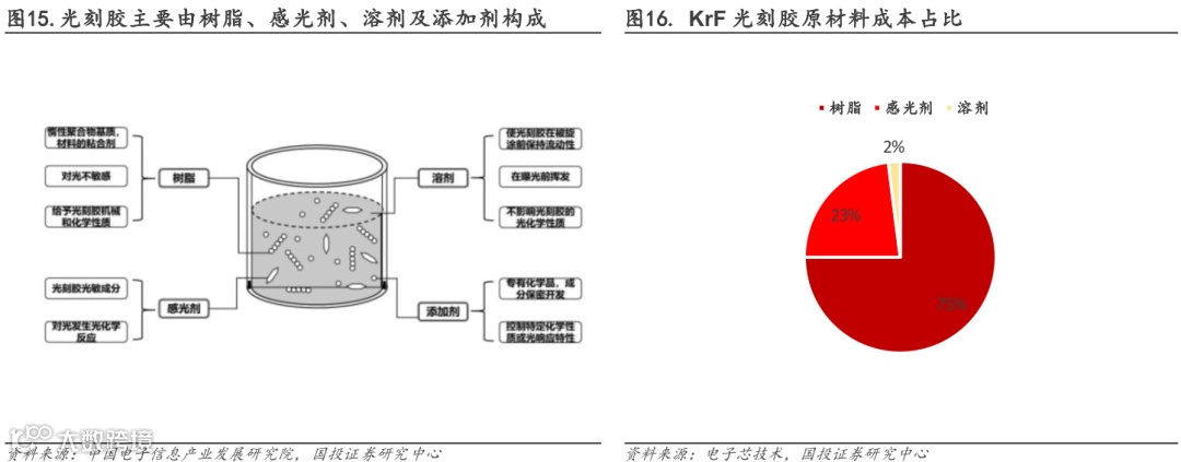 光刻胶主要由树脂(Resin)、感光剂(Sensitizer)、溶剂(Solvent)及添加剂组成。从成分来看,根据《中国石油和化工》期刊的数据,光刻胶含量成分占比分别为溶剂50-90%、树脂10%-40%、感光剂1%-8%、添加剂1%。从成本来看,树脂占光刻胶总成本的比重最大,以KrF光刻胶为例,树脂成本占比高达约75%,感光剂约为23%,溶剂约为2%。根据南大光电公告,在ArF光刻胶中,树脂以丙二醇甲醚醋酸酯为主,质量占比仅5%-10%,但成本占光刻胶原材料总成本的97%以上。