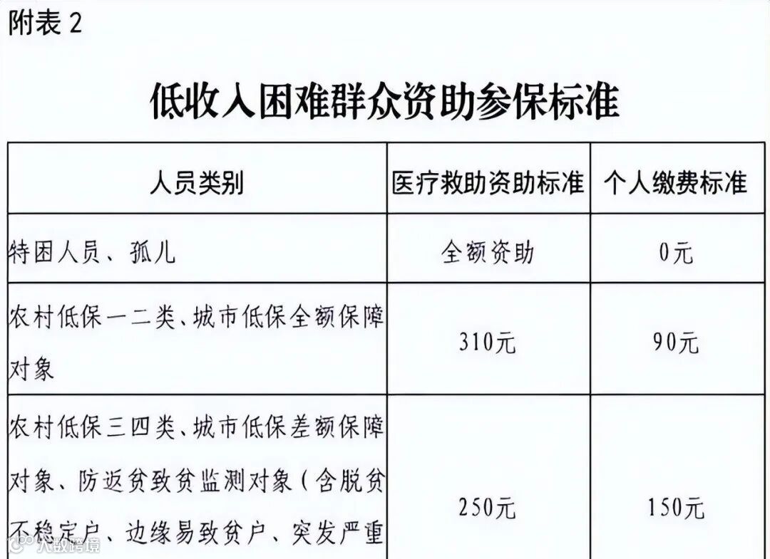 全额资助对象:特困人员、孤儿、事实无人抚养儿童个人缴费部分由医疗救助基金全额承担,无需个人缴费。
