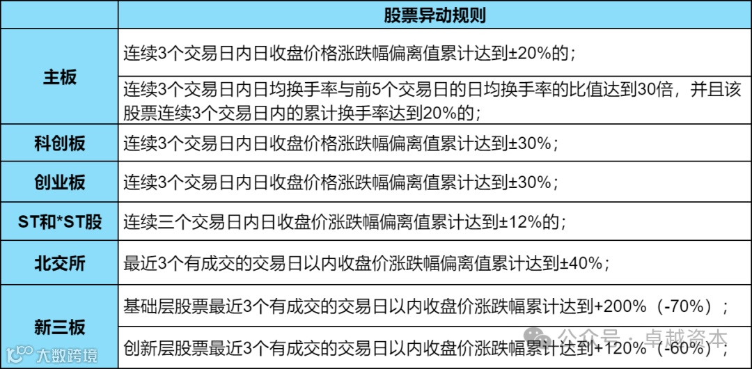 - 主板股票连续3日涨跌幅偏离值累计达±20%;