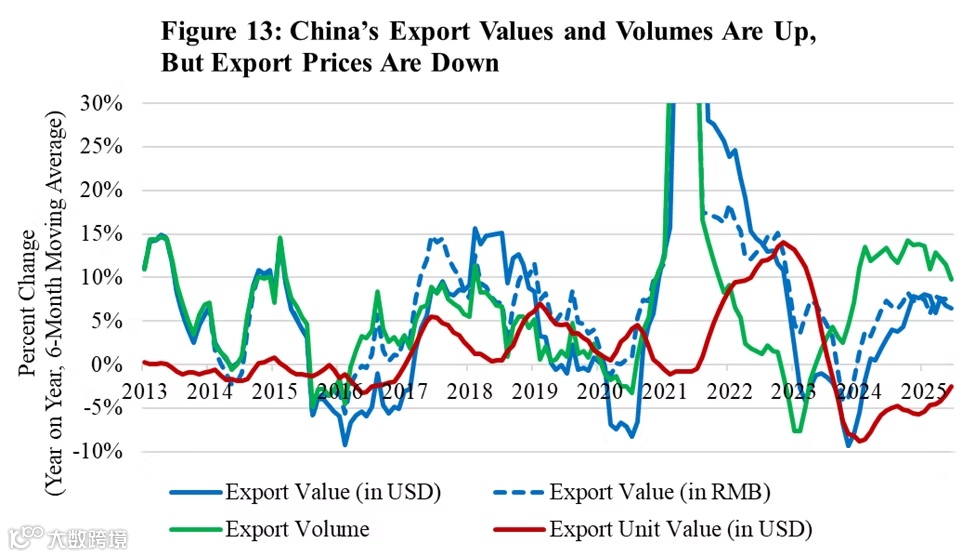 根据PRC Leader基于海关总署数据的分析显示,过去一年,中国出口量增长与出口单价增长之间的差距达到了十多年来的最大水平。[1]这意味着,许多中国企业仍在依靠“以价换量”维持增长,“规模扩张”与“健康增长”之间的矛盾日益尖锐。