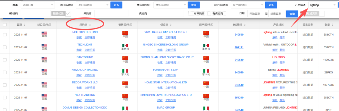 在搜索栏输入 lighting,筛出的都是国外采购商。每个客户对应的供应商名称,交易的产品描述,Hs编码也都能看到。