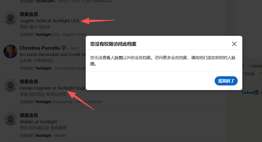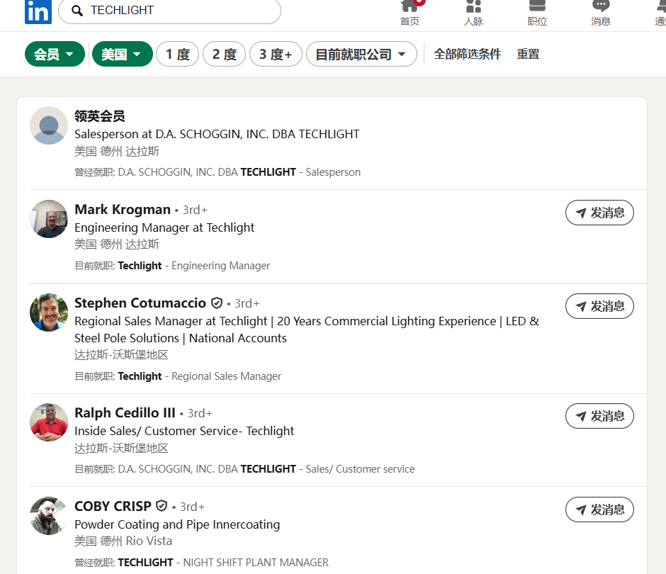 复制公司名称,在LinkedIn 搜索公司名, 切换到「会员」,限定下国家区域,你就能看到在这家公司任职的所有人,根据职位(如采购经理、CEO、import manager)找到关键决策人!