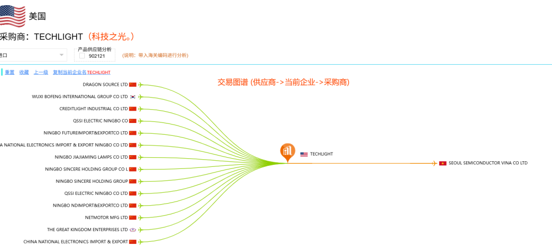 可以看到他的上下游供应链,他从哪些供应商那里购买,又要供货给谁(他的采购商) 看的一清二楚。