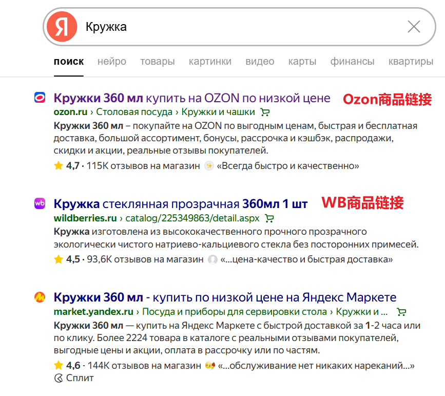 具体来说,当买家在Yandex搜索某些关键词时,你的商品卡会出现在搜索结果页首行的醒目位置。周围虽然也会有同类竞品,但你的链接将占据一个极具优势的展示位。这种基于搜索意图的流量通常比较精准,而且曝光位置靠前,很容易吸引用户的注意。