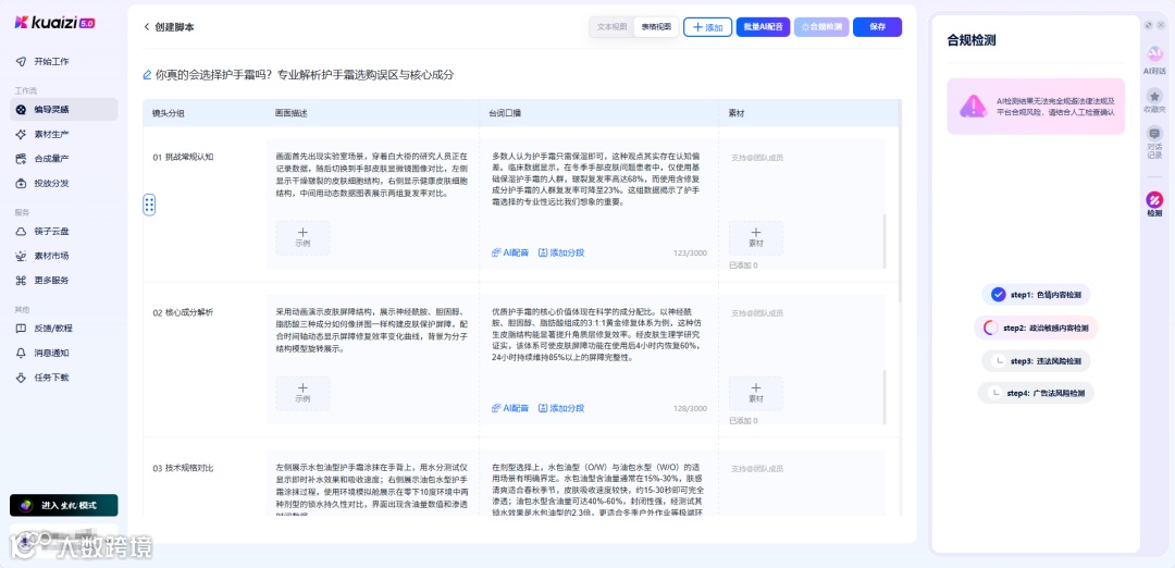 脚本生成、素材生产,到成片质检、合规提示、批量内容管理,