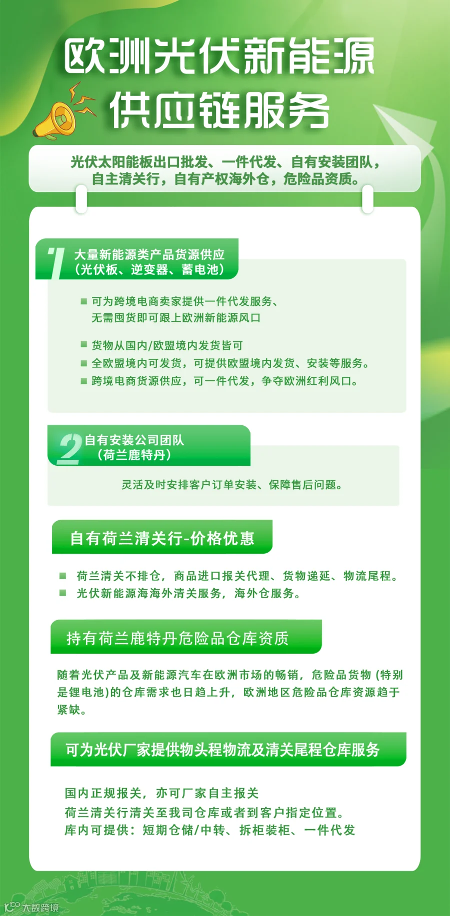 恒仓引力荷兰海外仓,专为新能源企业卖家提供太阳能组件类产品存放,仓库持有欧盟危险品存放资质,可提供仓储、欧盟尾程派送服务。