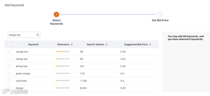 转到营销中心--选择赞助商解决方案--选择任何具有持续手动搜索广告的产品(或新创建一个)--单击添加关键字。