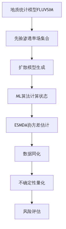 研究团队提出了一个框架,在CO2注入期间将基于分数的扩散模型与机器学习增强的定位集成在通道化储层中。该框架使用大型集合(Ns = 5000),其中渗透率由扩散模型生成,状态由简单的ML算法计算,以改进集合平滑器多数据同化(ESMDA)的协方差估计。