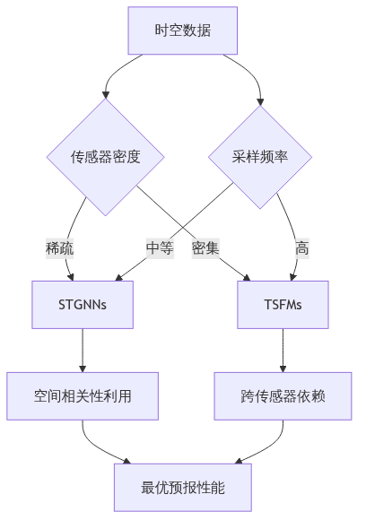- 当传感器部署稀疏且采样率中等时,STGNNs有效,通过编码的图结构利用空间相关性来补偿有限的覆盖 - TSFMs性能