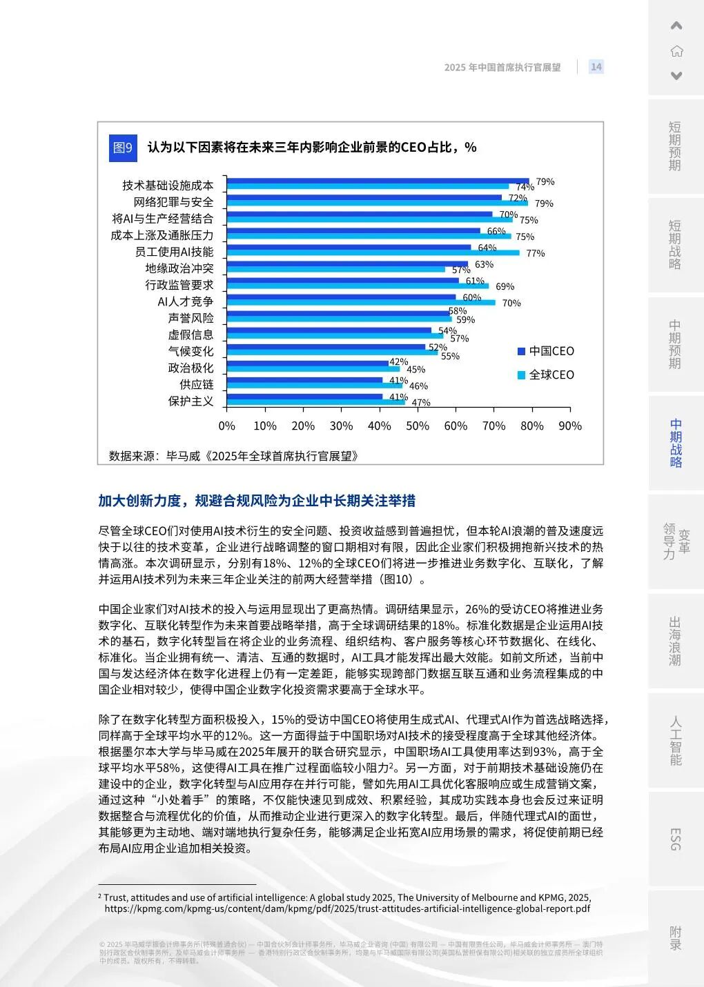 面对“内卷式”竞争,企业将“研发创新以发展新质生产力”视为首要战略(52%),超越成本管控。AI技术成为推动创新的关键工具,59%的CEO将其列为优先投资项,86%预期三年内看到投资回报。AI应用从效率提升向决策支持与业务创新延伸,但企业在技术认知与基础设施成本方面仍存顾虑。