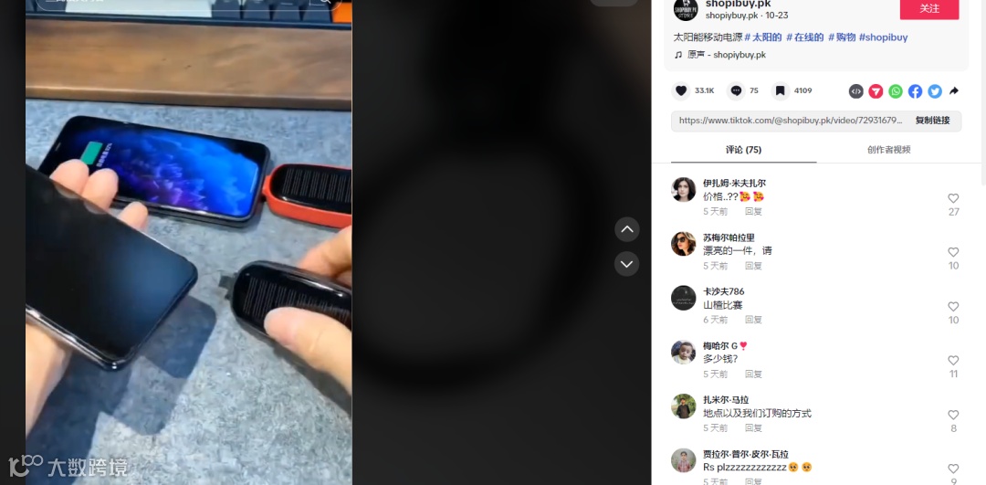 近期,TikTok上昵称为@shopibuy.pk的博主分享了一款便携款太阳能充电宝引起热议,短短11秒的视频获得300万次观看,3.3万个点赞,还有4109个用户收藏。