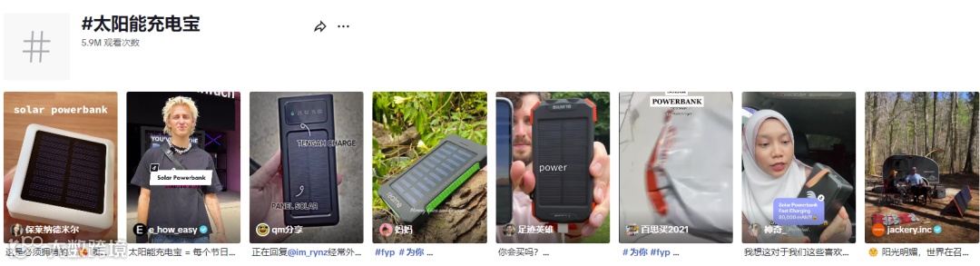 TikTok上“#solarpower”(太阳能)话题超11亿次观看,“#solarpowerbank”(太阳能充电宝)话题热度已达590万次播放,许多户外爱好者将被种草太阳能充电宝。