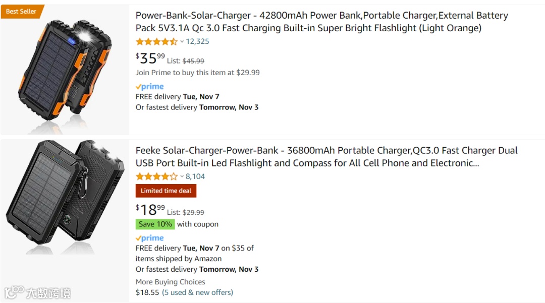 通过搜索,亚马逊美国站点,畅销款太阳能充电宝售价在35.99美元左右,商家提供免费送货服务并承诺送达时间,商品详情页中,太阳能充电宝适用的设备、场景都有详细的描述,方便用户购买。