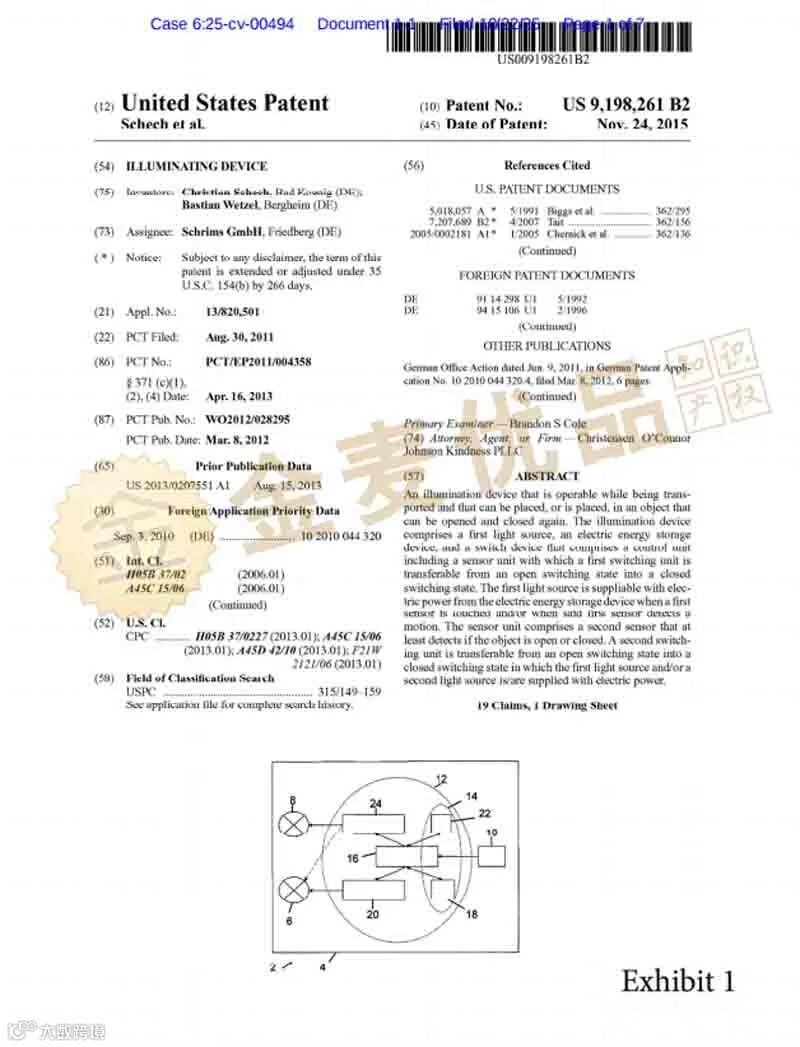 原告维权的核心专利为美国发明专利US 9198261,于2015年11月24日获得认证,金麦优品建议卖家对比专利技术特征,如其核心储电模块、调光方式、开关设计等维度展开全面排查,若存在高度相似性,则需立即下架,避免后续案件缺席判决后导致账户资金被划扣!并在选品过程中,认真通过专利数据库核查技术风险,优先选择有授权或自主创新的产品来避免因侵权问题导致的TRO冻结风险!