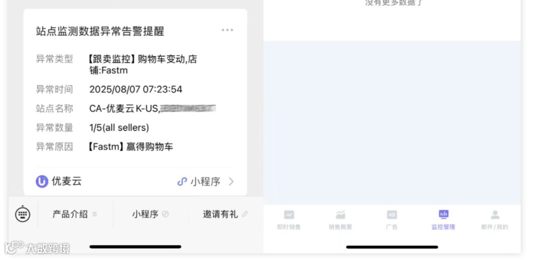 优麦云的监控逻辑比较成熟。先把要监控的ASIN绑定进去,系统会自动监控卖家数量和购物车情况。如果有跟卖出现,系统会立即通过微信提醒你。这种实时性非常关键,因为能抓住证据的跟卖,后面投诉成功的概率也会更加大。