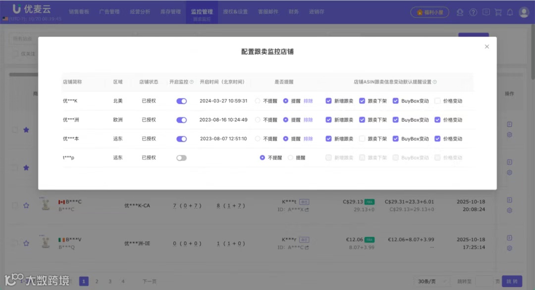 被跟卖最大的问题不是跟卖本身,而是发现得太晚。很多跟卖者是晚上十点上架,凌晨四点下架,第二天再看已经完全找不到证据。店铺越做越大后,几十上百条链接靠人工盯根本不现实。这就是为什么大部分老卖家都用第三方工具进行自动监控,比如优麦云的跟卖监控功能。