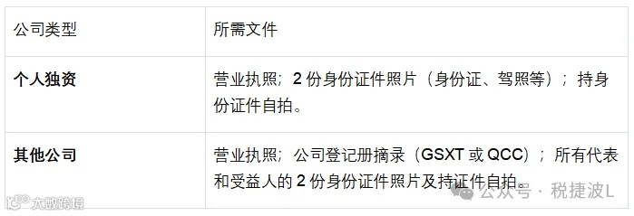 - 特殊要求:中华人民共和国注册的公司,需提供2份身份证件。