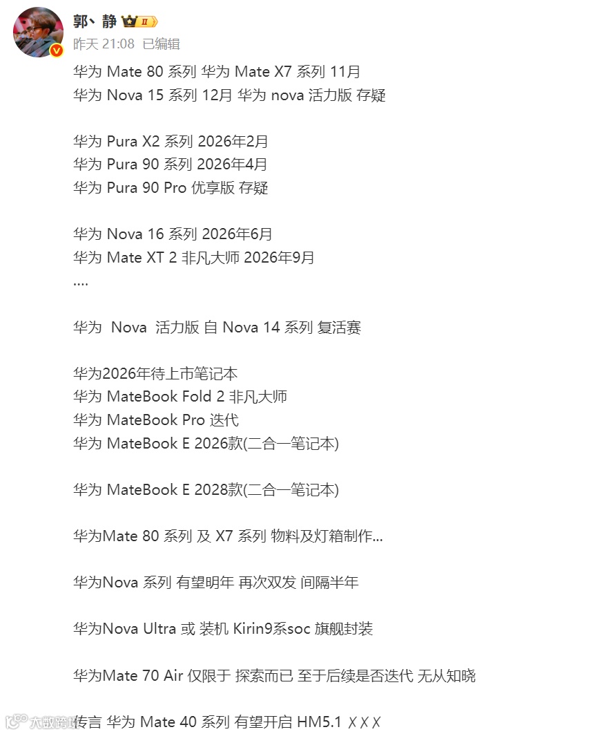 近日,一份被数码博主曝光的华为新品发布路线图极具吸引力,其内容十分详细,规划还非常长远。