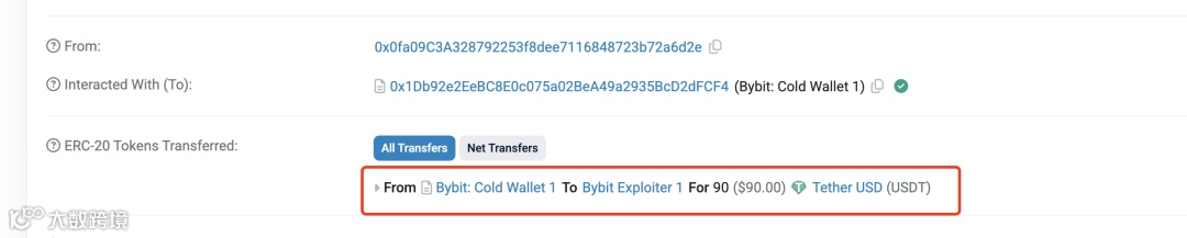 其功能就是将指定的冷钱包中指定的 token 余额转入⽬标钱包,攻击者依次将冷钱包中的 90 USDT ,