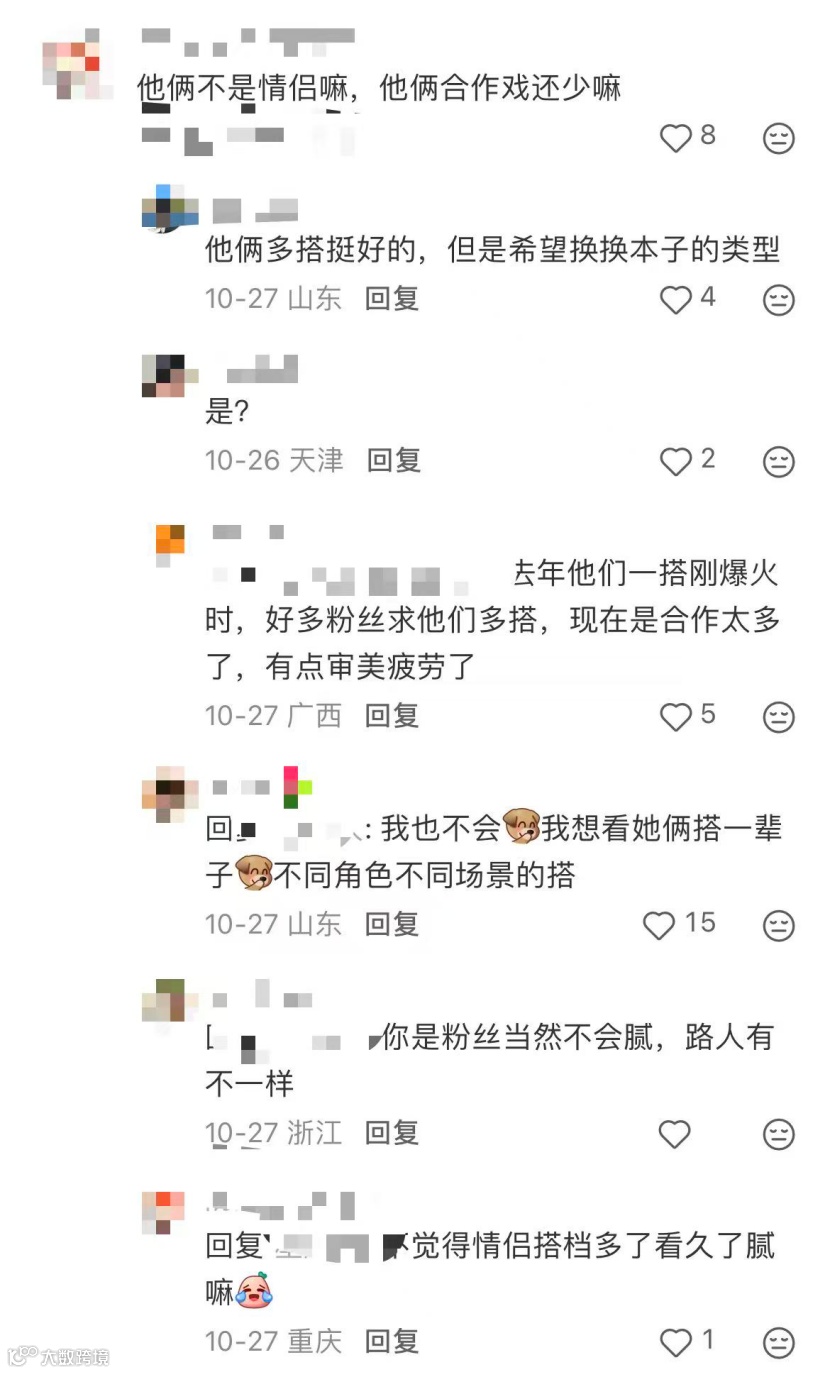 其二是观众的审美疲劳,多搭虽然会带来保险的基本盘,但也有观众直言“看久了难免觉得套路化”,搭档固定会疲劳。这种困境在短剧行业尤为突出,CP的强绑定虽能带来短期流量,却会固化演员的荧屏形象,让观众难以接受其脱离CP的独立角色。