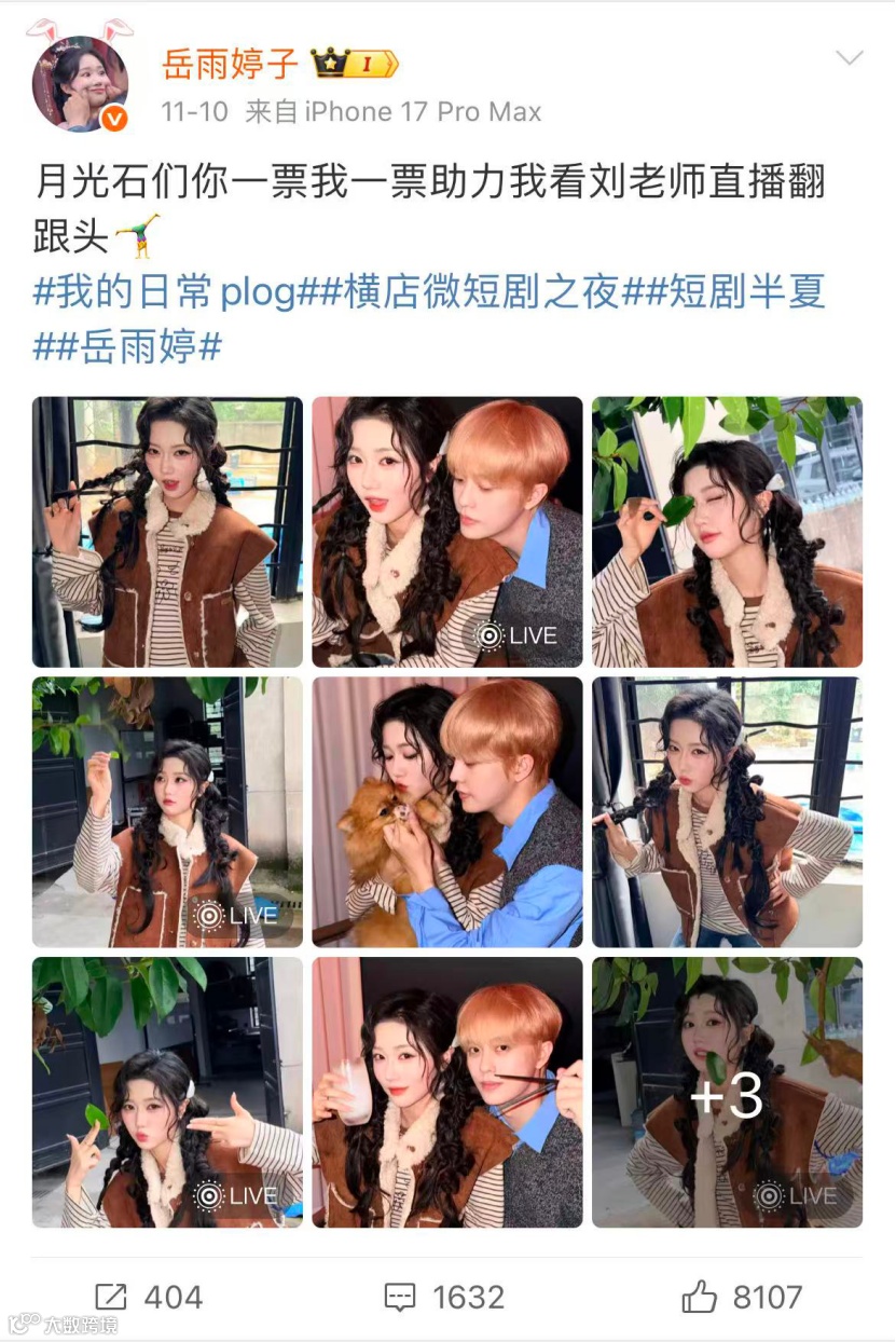一周前,岳雨婷发了一条带与刘润铭“铭岳入怀”CP合照的微博,引发了唯粉不满——非剧宣期频繁互动被批“过度捆绑炒热度”,唯粉集体呼吁岳雨婷“独美”,指责其为男方“抬轿”消耗个人口碑。
