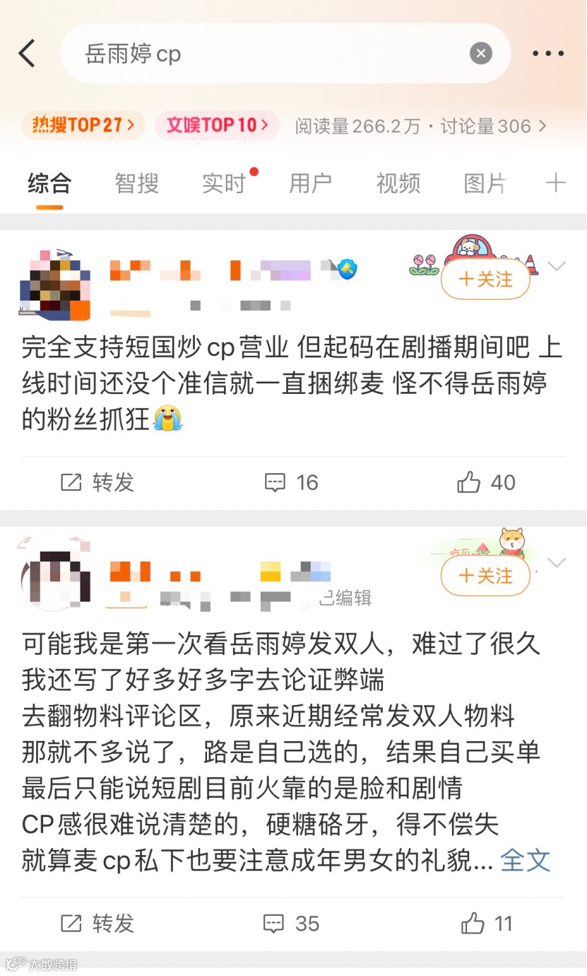 但如若CP双方“捆绑过紧”,也有可能会成为个人发展的枷锁:其一,演员可能会受到CP粉的“排他性”抵制,曾辉与韩雨彤尝试与其他演员合作时,就有极端CP粉留言“只看你们俩合作”“换搭档就弃剧”,给二人的戏路拓展制造阻碍。