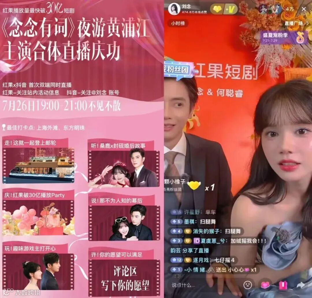 今年8月,在“百念好何”《念念有词》红果30亿播放量的邮轮庆功会上,活动方设计了“接新娘上游轮”的双人直播流程,最高观看人数达4万,被粉丝戏称为“沉浸式婚礼直播”。