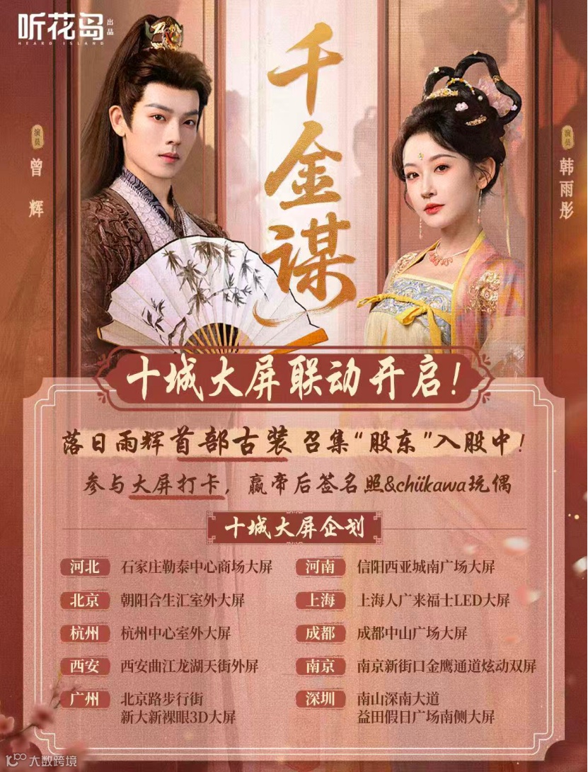《千金谋》上线前一个月,粉丝拍摄剪辑的曾辉韩雨彤路透同框视频,点赞量就破40w;二人参加微博视界大会时,高甜互动引发热议,顺带为新剧《千金谋》做了预热。剧播后,两人抖音小号打卡剧宣大屏的短视频,均突破20w赞,进一步助推了剧的热度。