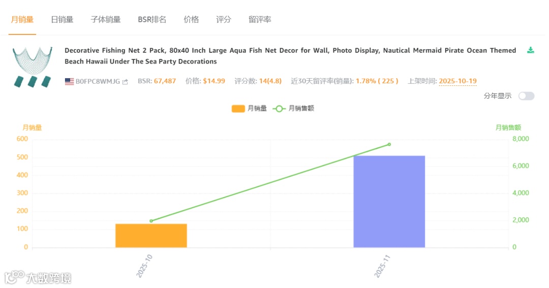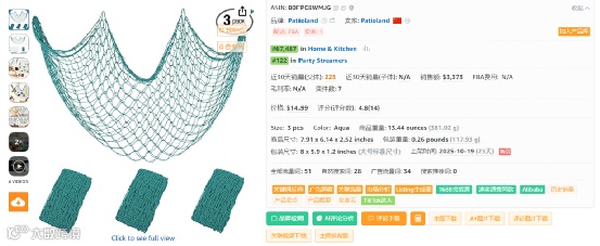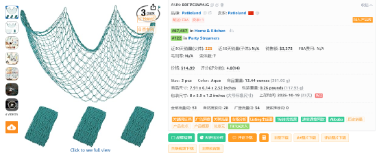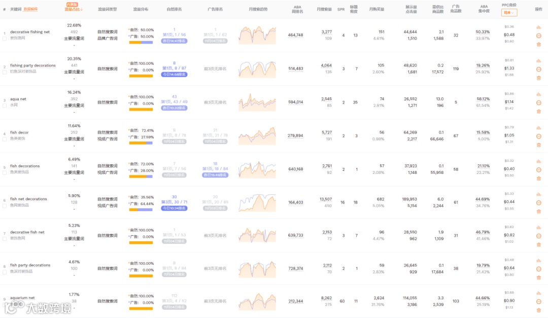 反查结果显示,所有流量词几乎都是广告流量。其中主要流量词decorative fishing net的ppc竞价0.48美金,主要流量词fishing party decorations的ppc竞价1.33美金,主要流量词aqua net的ppc竞价1.14美金,主要流量词fish decor的ppc竞价1.05美金,主要流量词fish decorations的ppc竞价0.4美金。