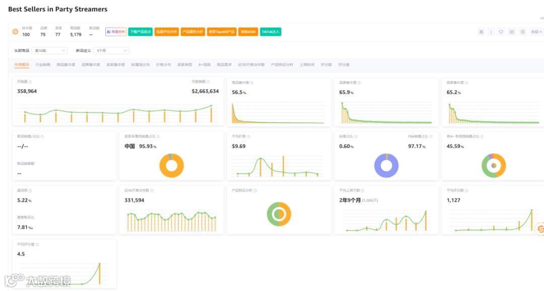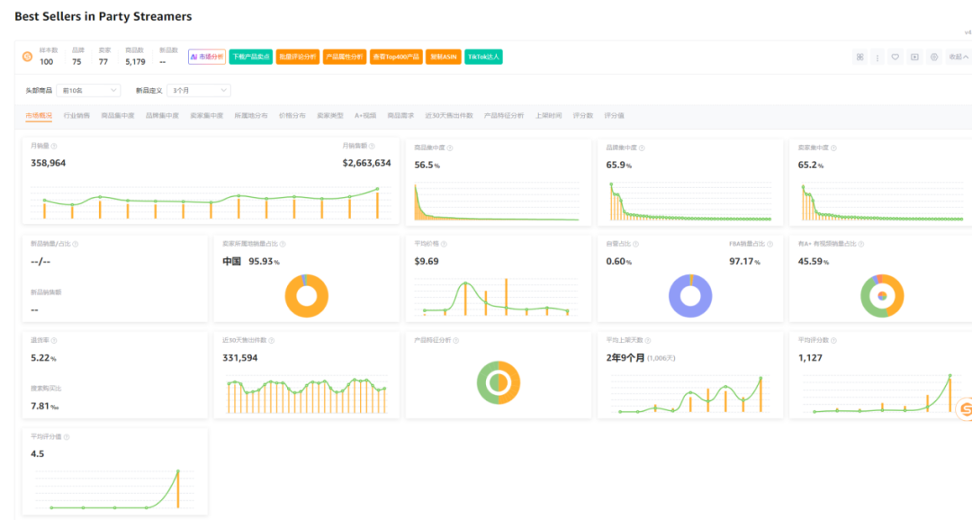 市场数据显示,100样本中新品有0个,新品销量占比0%,商品集中率56.5%,品牌集中度65.9%,卖家集中度65.2%,中国卖家占比95.93%,类目退货率5.22%。