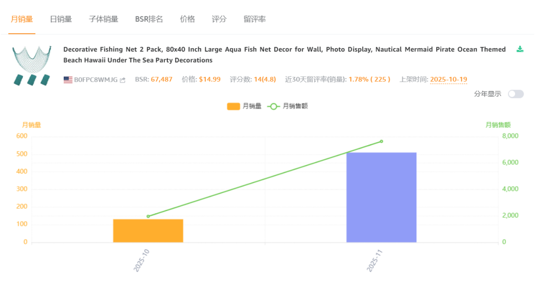 卖家精灵数据显示,这产品三个一组整体上架,有7个变体,当前刚上架23天,上架即出单,目前父体销量已经有228单,成长迅速。
