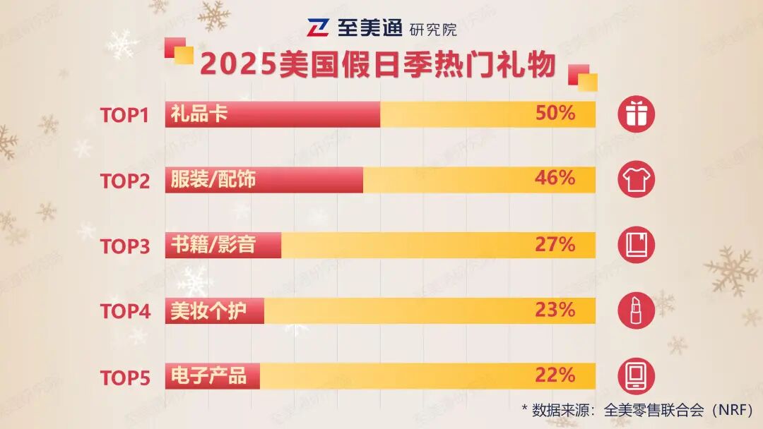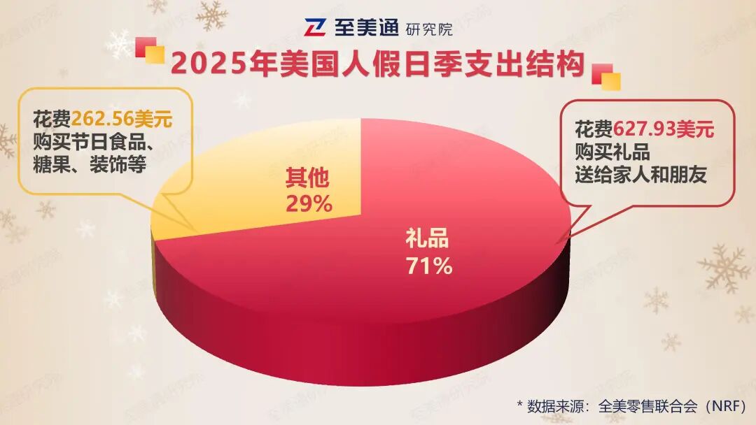 礼品是今年假日支出的核心,占总支出的七成以上。即便在通胀和关税压力下,美国人依然愿意为亲友和节日氛围投入预算。