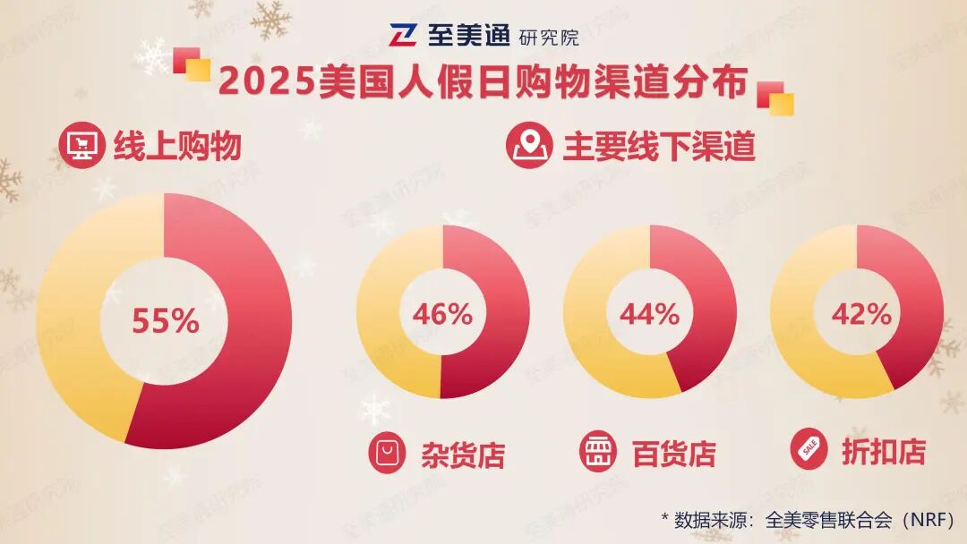与往年一样,美国消费者将在多个渠道间分配假日支出。其中,线上购物仍然领先于线下渠道,占比55%。而主要线下渠道依次为杂货店(46%)、百货商店(44%)和折扣店(42%)。