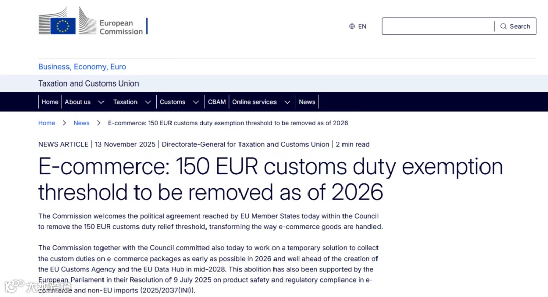 欧盟计划遏制中国低价商品的无序涌入!将提前实施“取消小额进口包裹免税”政策。