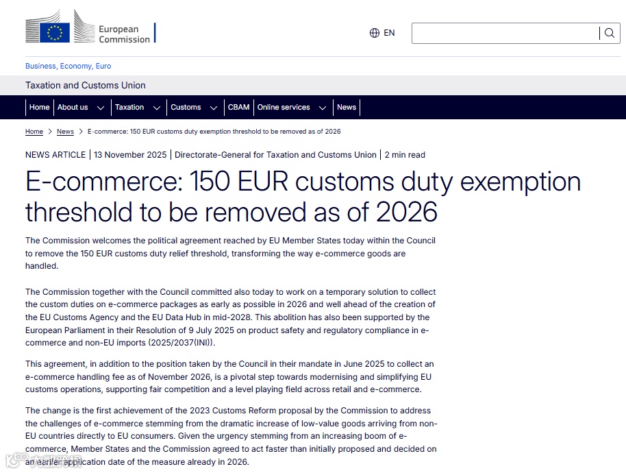欧盟将原定于2028年实施的进口税收新政提前至2026年落地。根据新规,所有源自欧盟以外的包裹,无论货值高低,均须进行申报并缴纳关税与增值税。