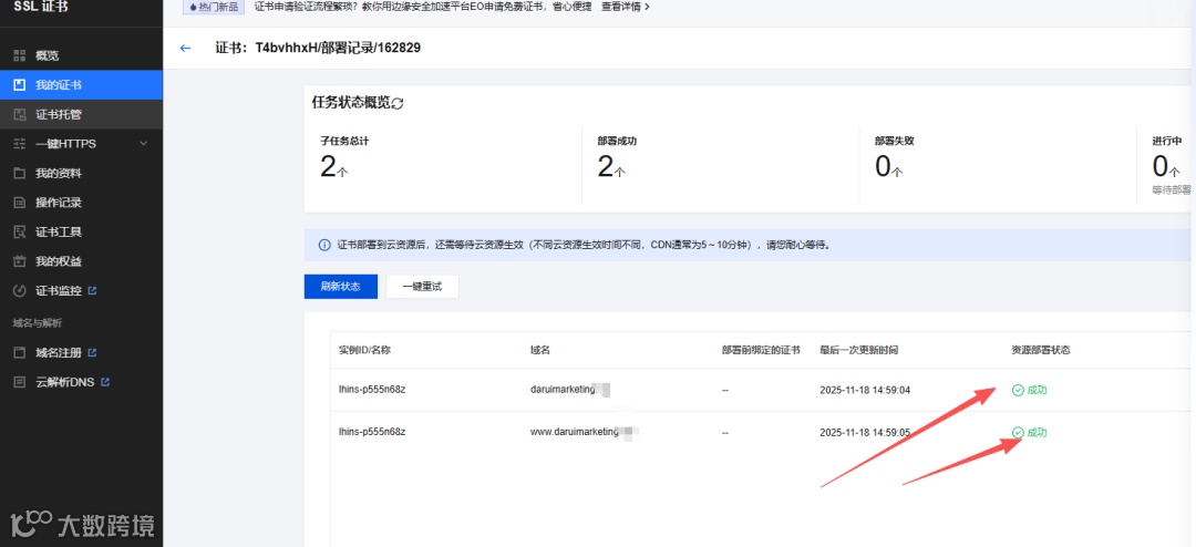 在证书部署页面,根据页面提示,勾选跟证书域名匹配的轻量应用服务器实例