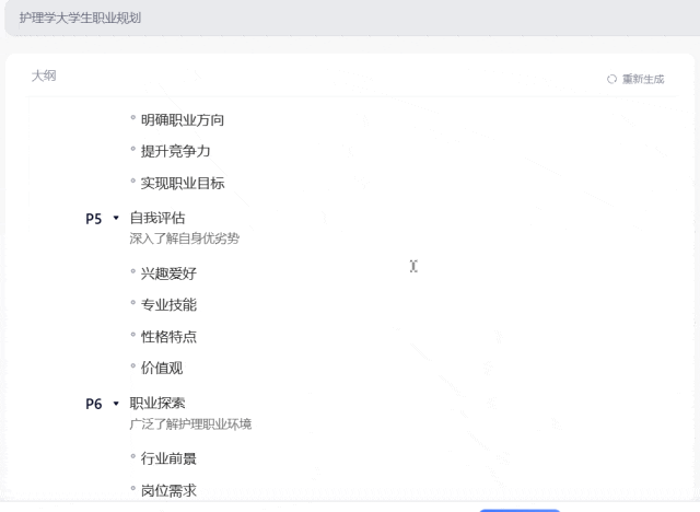 我们只要在对话框输入想要生成的内容即可,比如,告诉它,我想要一个【护理学大学生职业规划】,它会自动帮我们生成大纲。