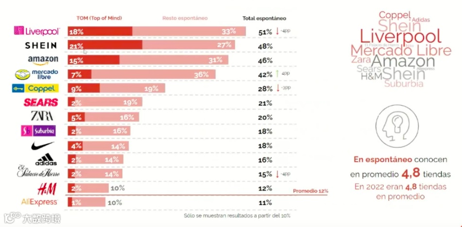 4.对于品牌而言,消费者对其形象的认知至关重要。在此领域,Liverpool 表现卓越,受到广泛关注;之后为 Shein,在消费者心中具有不可替代的地位。