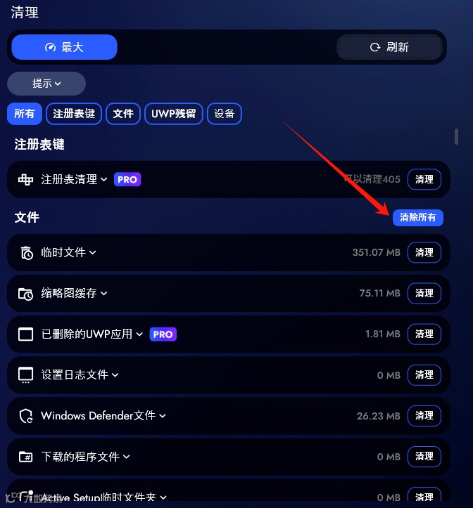 清理功能比较常规,主要用于清理电脑中运行时产生的各种缓存文件,从而优化电脑的运行速度。