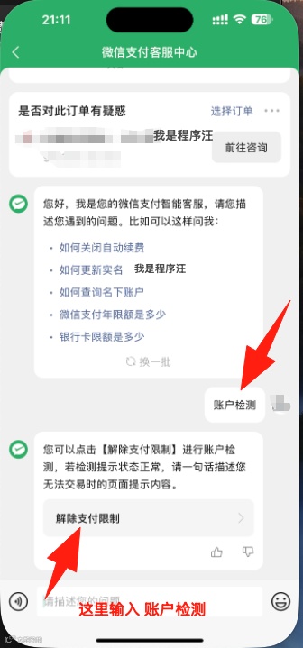 路径:微信→我→服务→钱包→客服中心→账户检测 -