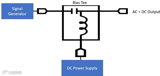 图1. 偏置三通(Bias Tee)可将信号发生器输出与直流电源输出耦合,但其功率处理能力存在限制