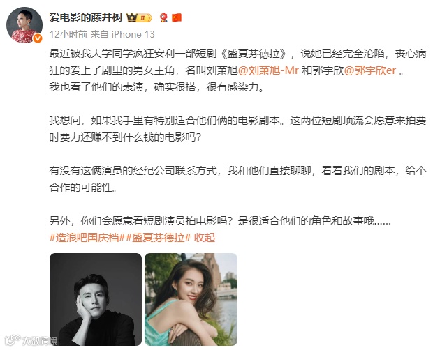 刘萧旭,1998年出生于山东泰安,毕业于四川传媒学院。因长相成熟稳重,被大家戏称为“小孩叔”。参演短剧还有《玫瑰冠冕》《深情诱引》《予我万丈光芒》《幸得相遇离婚时》。