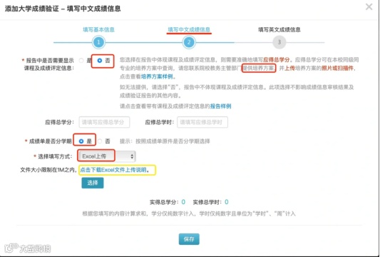 5.成绩评定信息选择“否”(如果选择是的话,后面需要上传学校出具的培养方案);成绩单是否分学期选择“是”;填写方式可以选择“Excel上传”