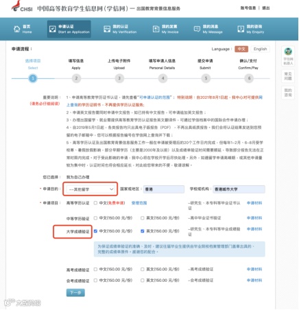 2.申请目的选“其他留学”:填写国家和地区以及学校名,申请项目选择“大学成绩验证”,中文英文全勾选,150元/份