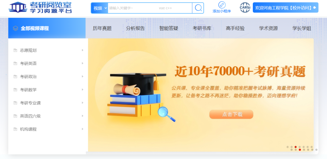 高校图书馆考研阅览室学习资源平台集全国十余家考研培训机构,上百名一线考研名师,数十家考研图书出版商等考研相关资源供应方为全国高校在校考生打造的一站式校内考研学习基地。通过线上线下相结合的服务方式,汇聚包括5000余小时的最新全年课程资源,200多品类各个阶段考研电子版复习资料,及多项考研全流程服务等,打通考研大学生初试复试各个环节,助力大学生考研无忧。
