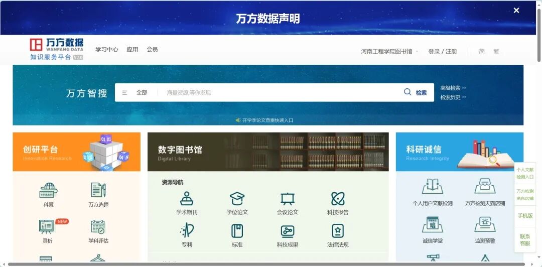 万方数据资源系统是中国科技信息研究所、万方数据集团公司开发的网上数据库联机检索系统,内容涉及自然科学和社会科学各个专业领域。它是一个集学术期刊、学位论文、会议论文、中外专利、科技成果、中外标准、法律法规、查新咨询服务中心与一体的数据资源系统。目前我馆订购了包括万方数据知识服务平台、中国学术期刊数据库、万方数据知识服务平台、中国学位论文全文数据库、万方数据知识服务平台、中外标准文摘数据库、万方数据知识服务平台、外文文献服务保障平台。